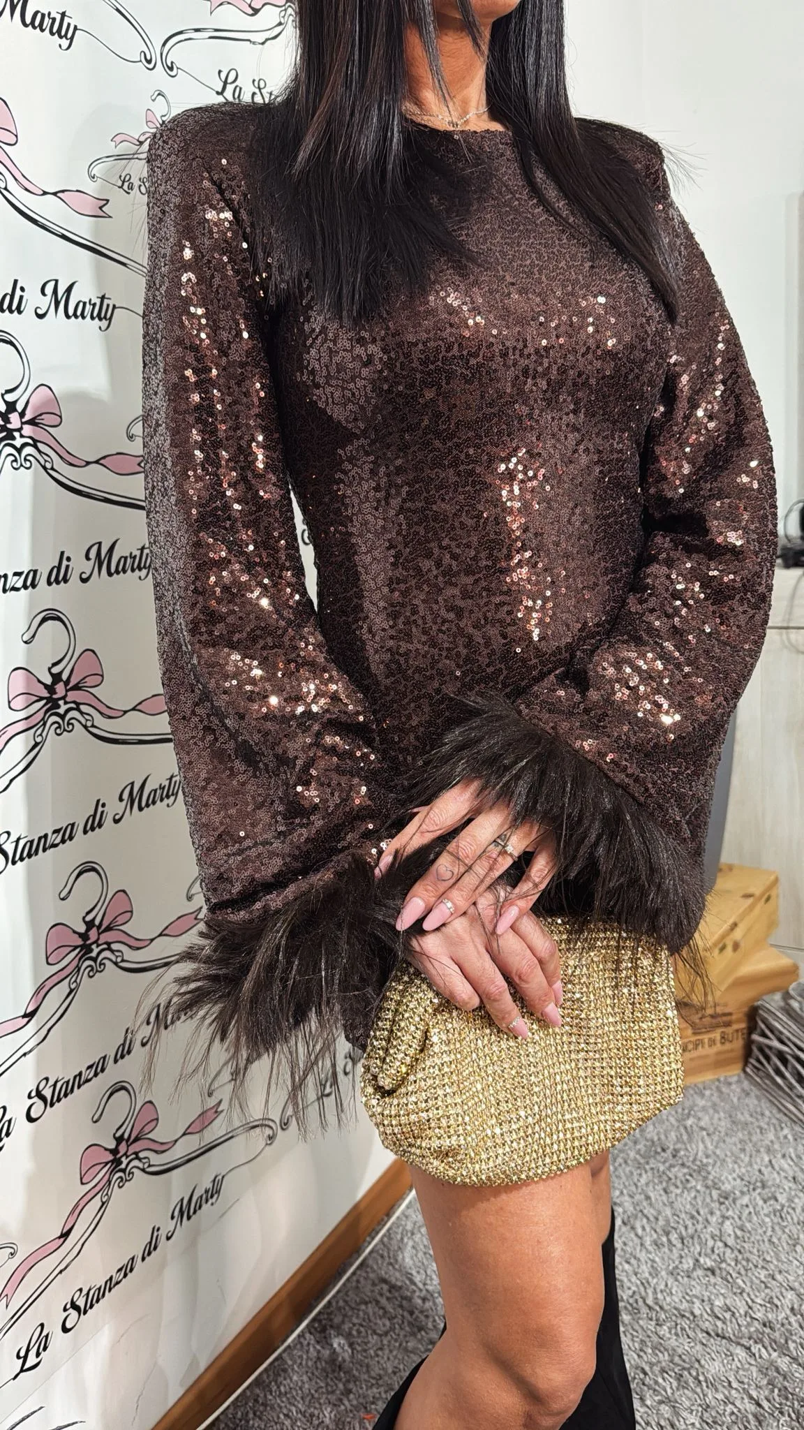 Vestito elasticizzato ricoperto di paillettes con particolarità sulle maniche