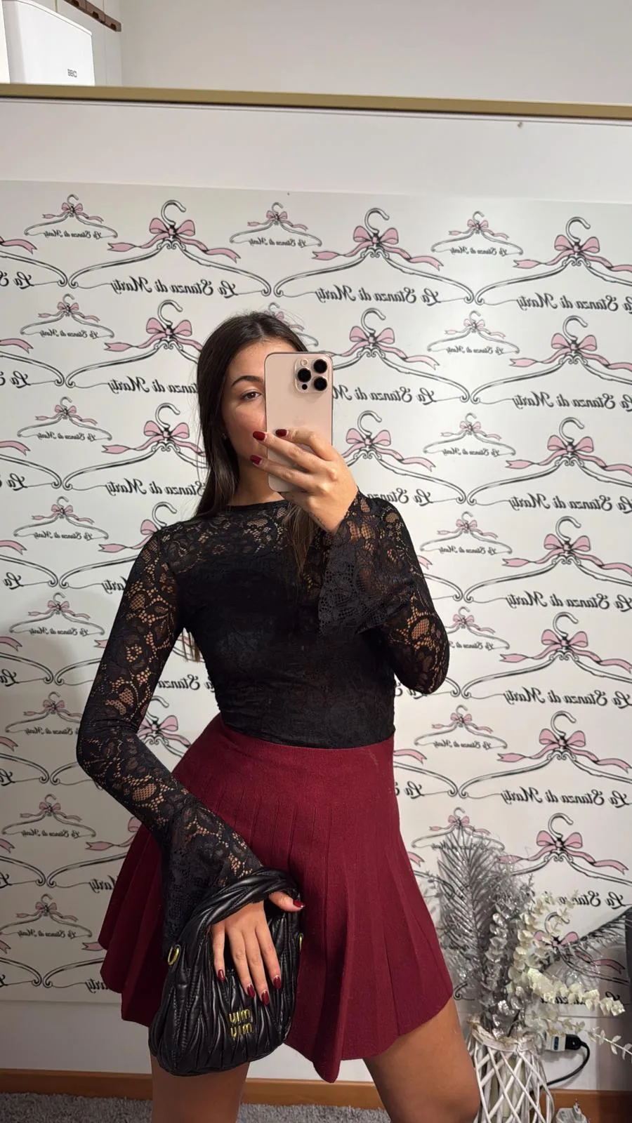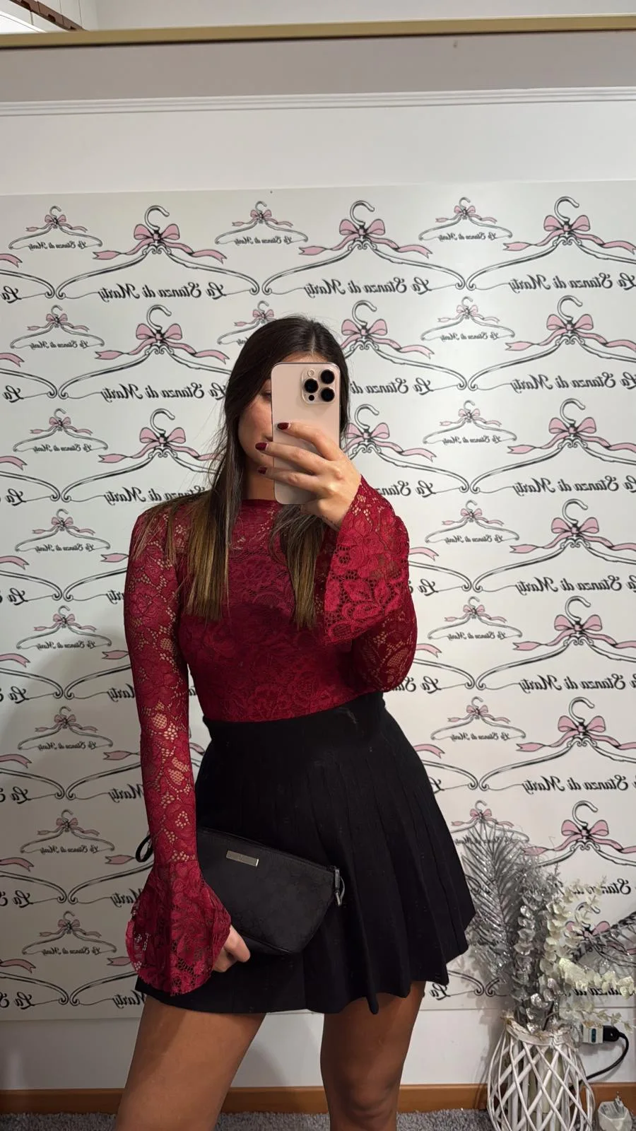 Eleganza e sensualità si incontrano in questo body in pizzo, caratterizzato da maniche scampanate e una schiena scoperta che aggiunge un tocco di femminilità audace.
