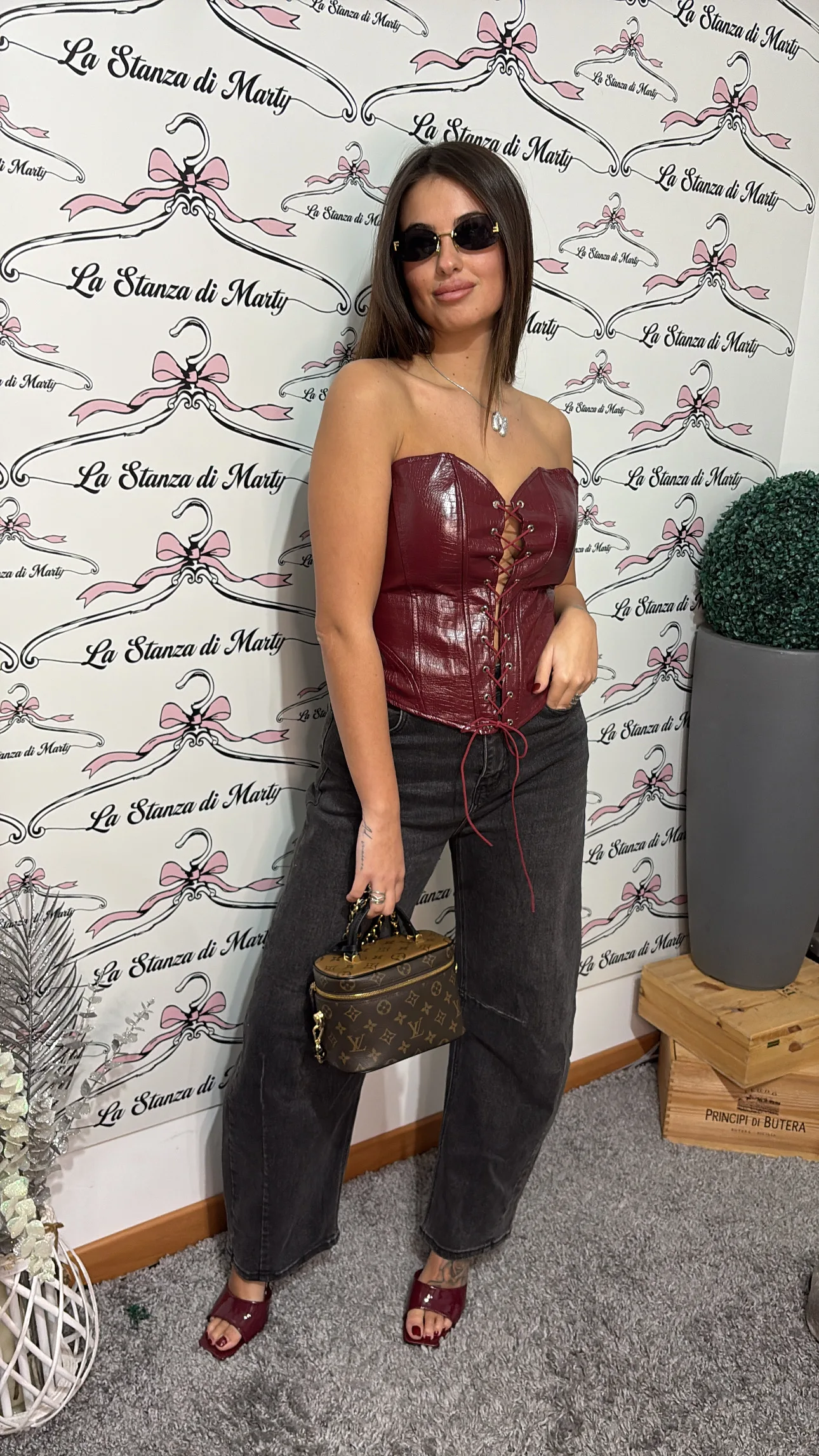 Bustino a fascia con chiusura stringhe sul davanti sul retro zip. Coppe performate imbottite.