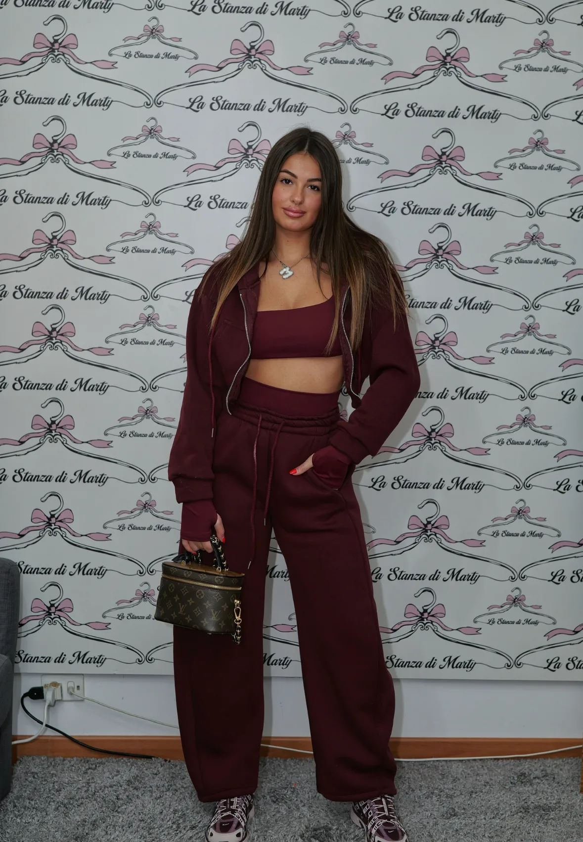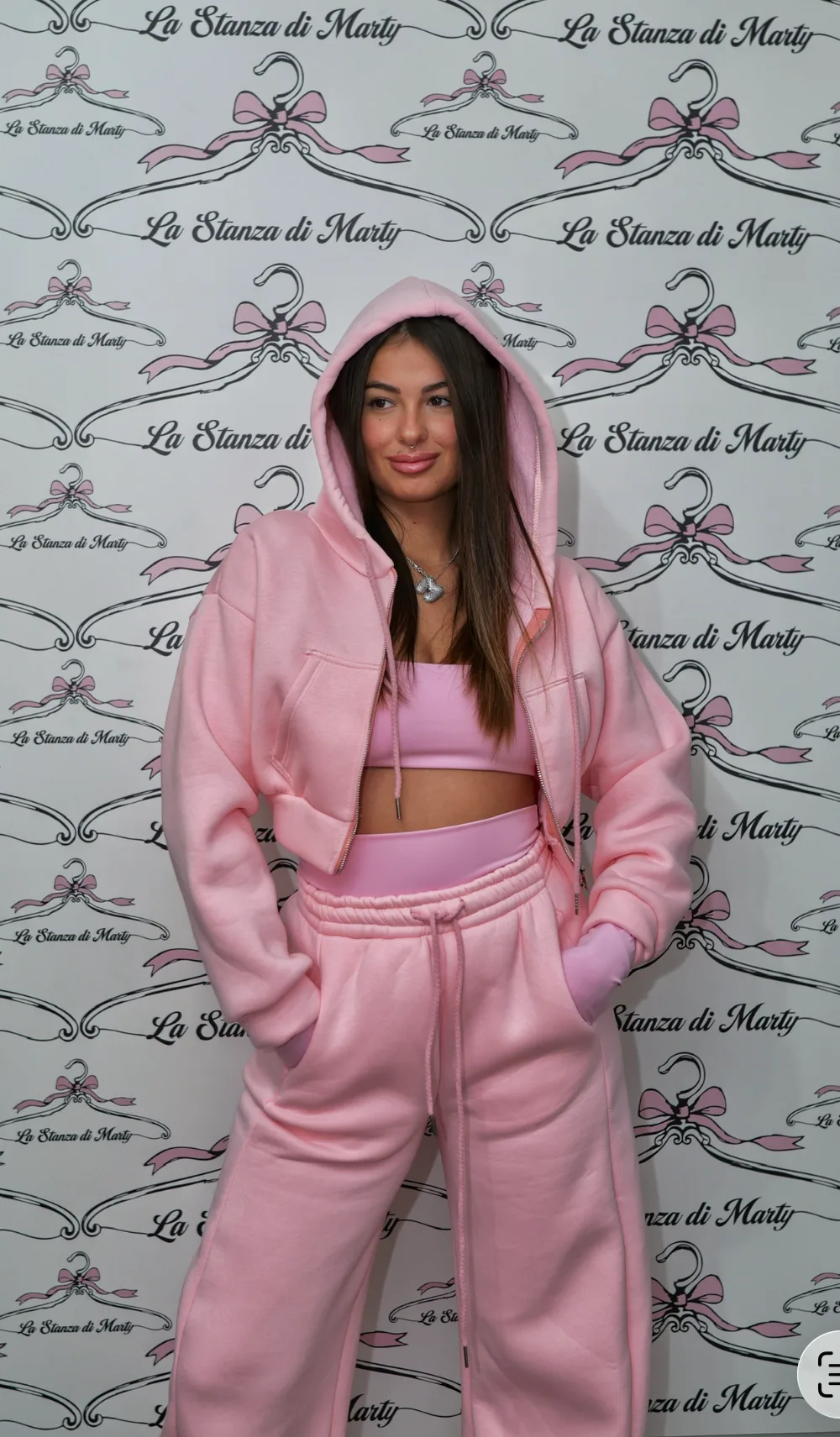 Completo tuta 3 pezzi felpato taglia unica composto da felpa crop con zip e cappuccio e pantaloni palazzo con elastico in vita, incluso top crop manica lunga con manicotto