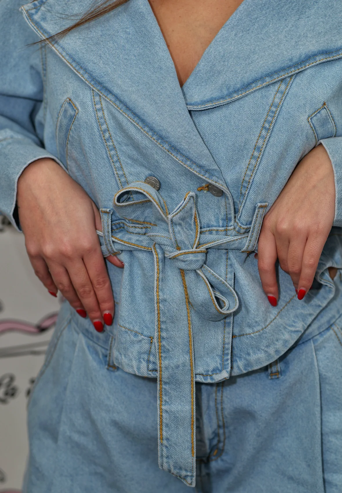 Coordinato composto da pantaloncino e giacca in denim con cintura in vita