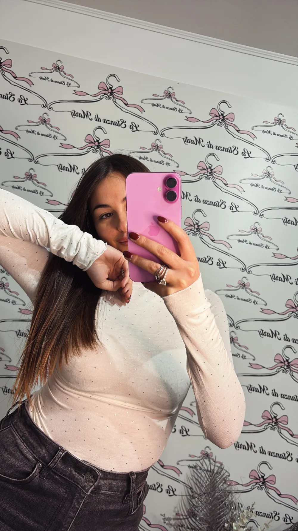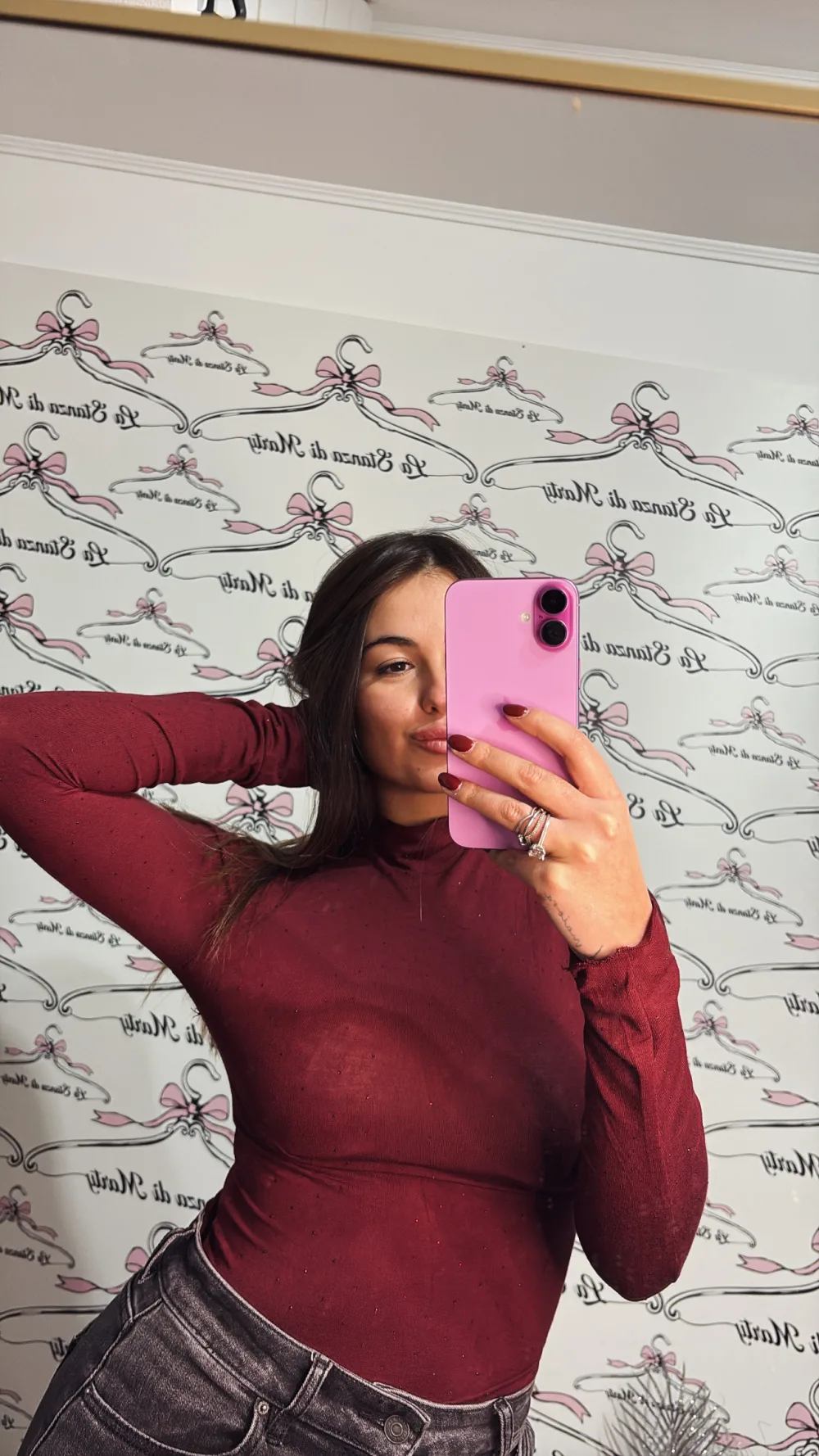 Maglia dolcevita taglia unica elasticizzata, tessuto semitrasparente ricoperto di strass.