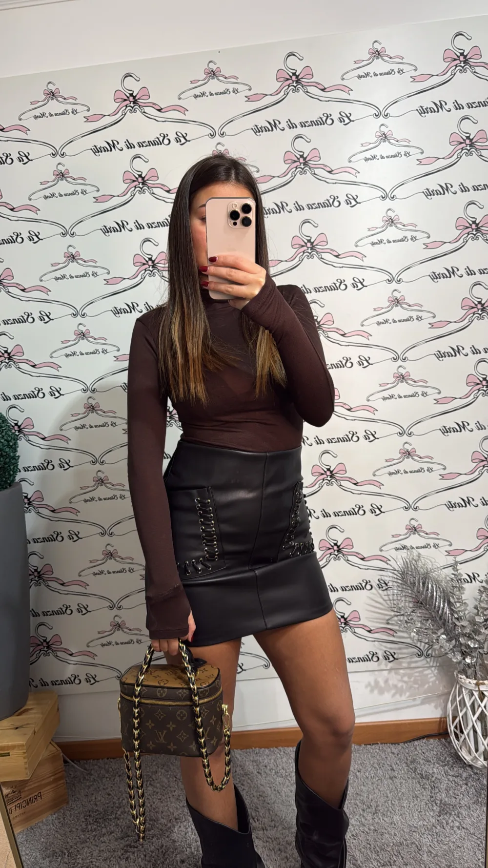 Minigonna in ecopelle con dettaglio impunture, chiusura sul retro con zip a scomparsa. Veste piccola