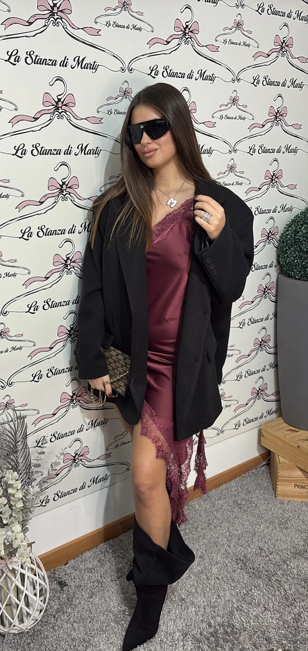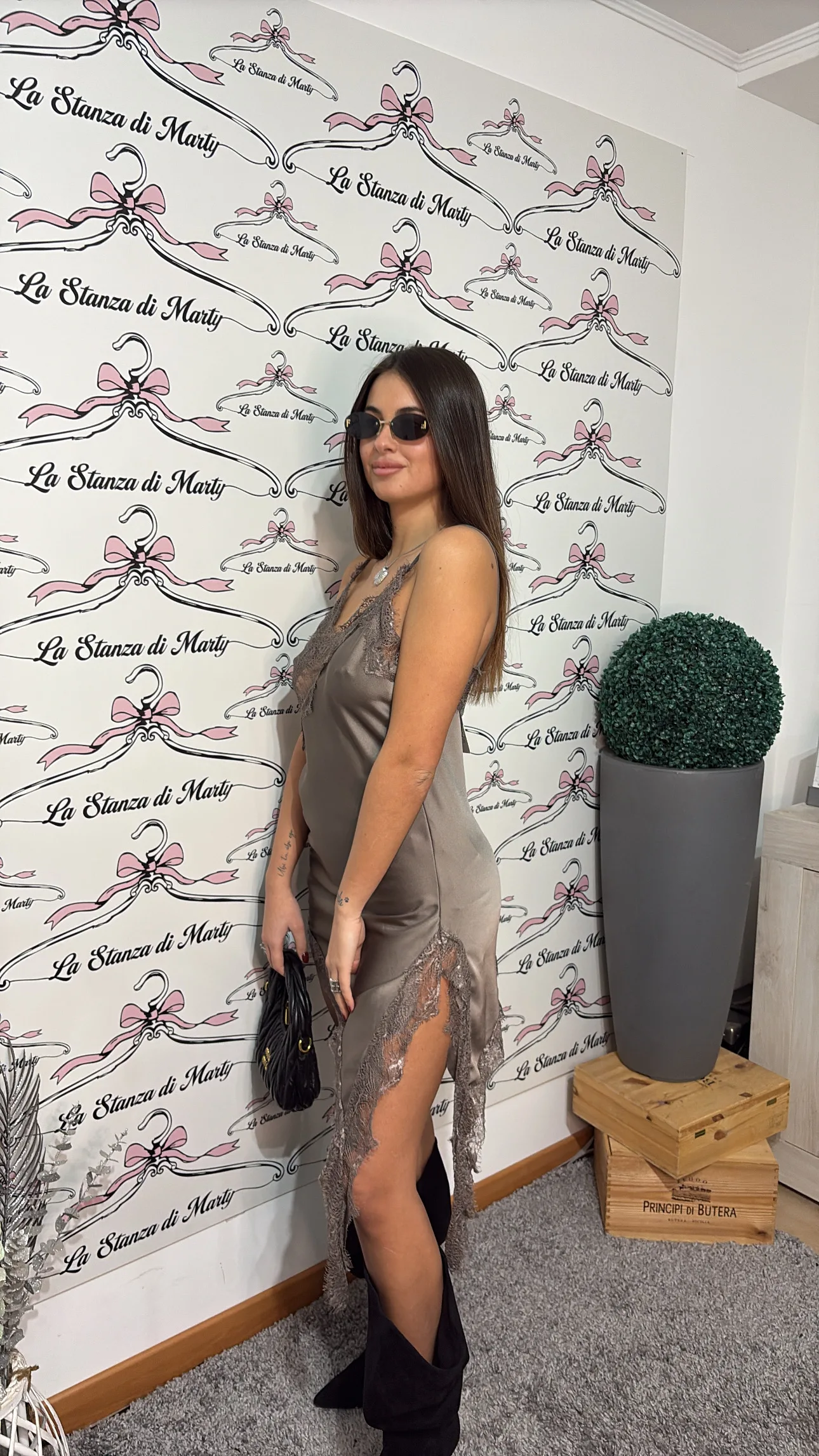 Elegante vestito in seta impreziosito da delicati dettagli in pizzo, che esaltano la silhouette con un tocco romantico e raffinato. Leggero, fluido e sofisticato.